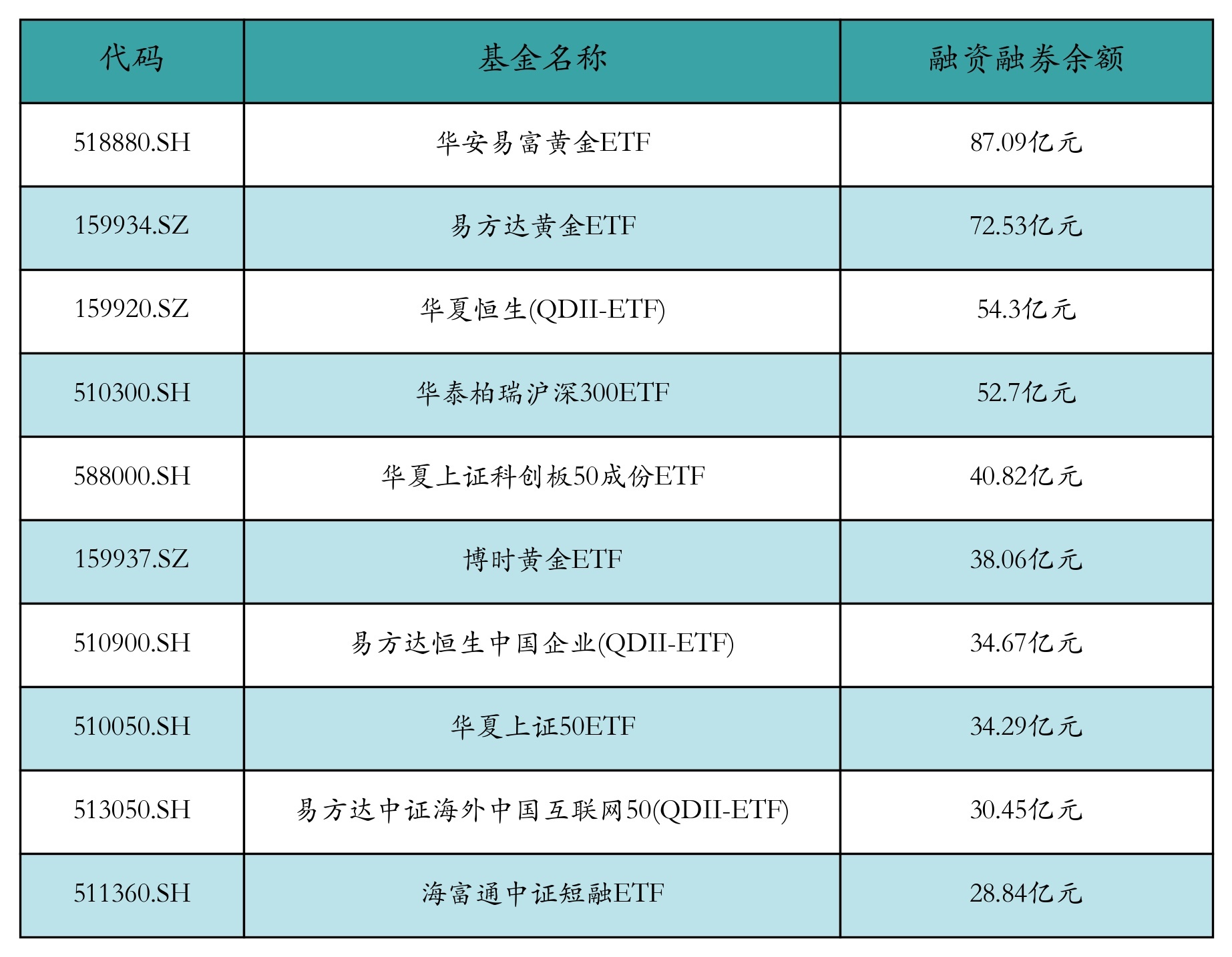 4月1日ETF两融余额前三位分别为:华安易富黄金ETF(87.09亿元)、易方达黄金ETF(72.53亿元)和华夏恒生(QDII-ETF)(54.3亿元),前10具体见下表: