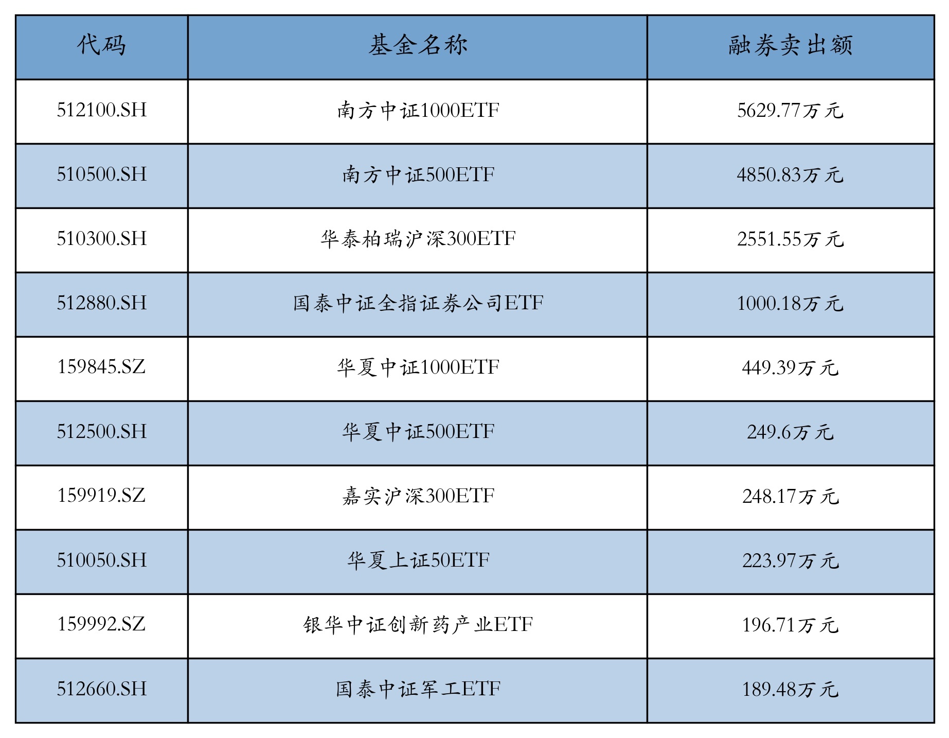 4月1日ETF融券卖出额前三位分别为:南方中证1000ETF(5629.77万元)、南方中证500ETF(4850.83万元)和华泰柏瑞沪深300ETF(2551.55万元),前10具体见下表: