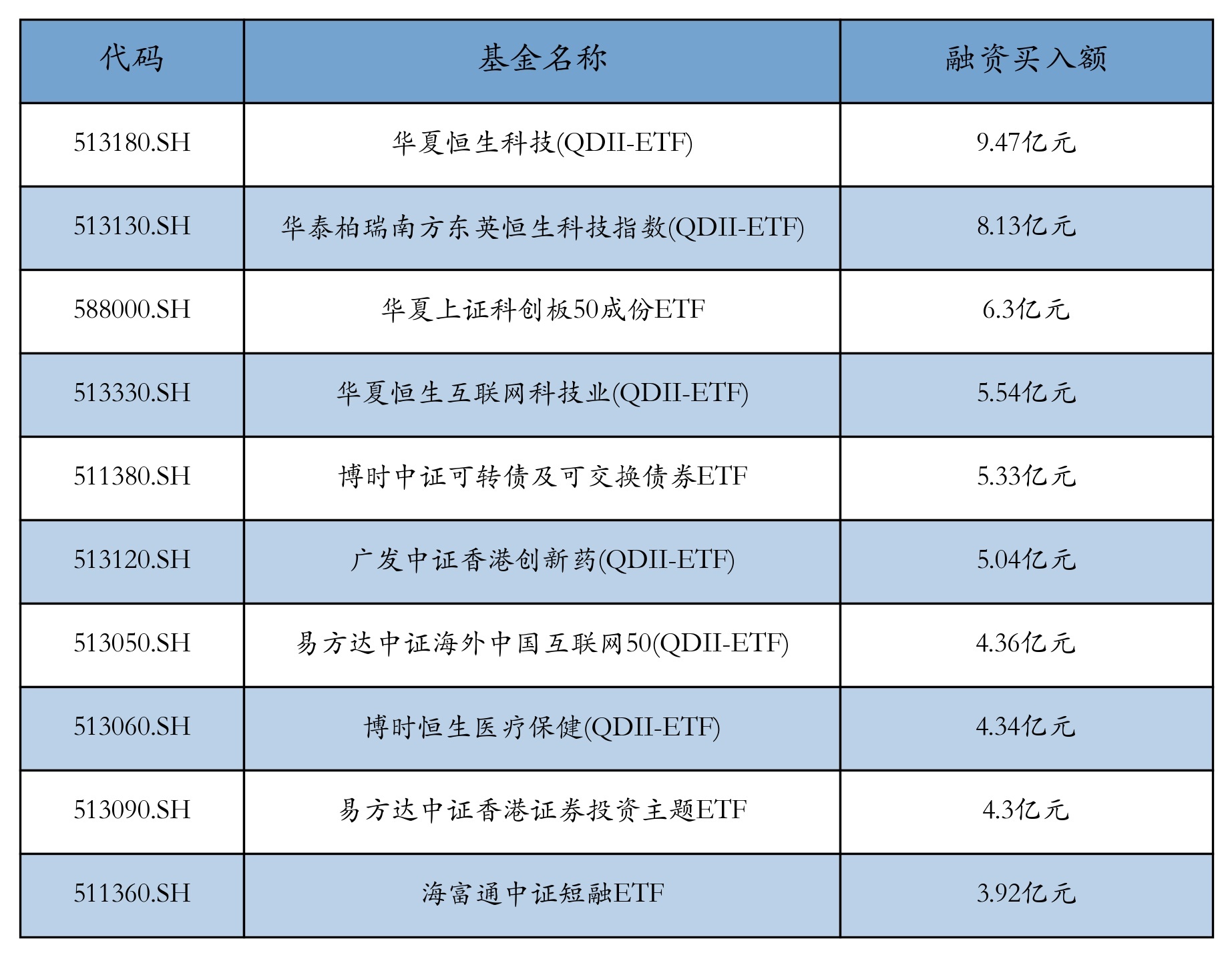 4月1日ETF融资买入额前三位分别为:华夏恒生科技(QDII-ETF)(9.47亿元)、华泰柏瑞南方东英恒生科技指数(QDII-ETF)(8.13亿元)和华夏上证科创板50成份ETF(6.3亿元),前10具体见下表: