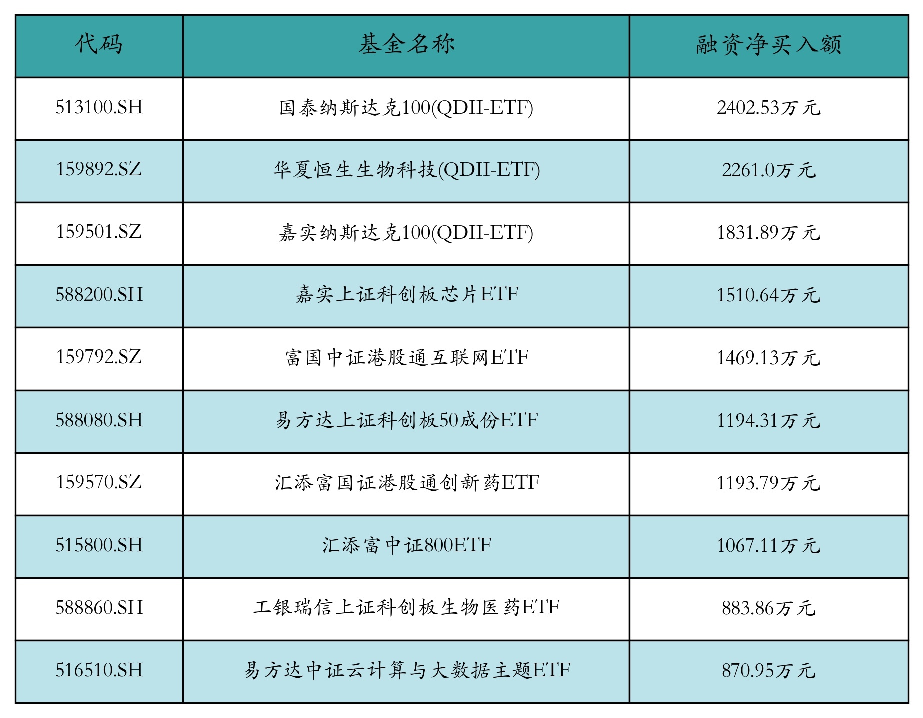 4月1日ETF融资净买入额前三位分别为:国泰纳斯达克100(QDII-ETF)(2402.53万元)、华夏恒生生物科技(QDII-ETF)(2261.0万元)和嘉实纳斯达克100(QDII-ETF)(1831.89万元),前10具体见下表: